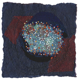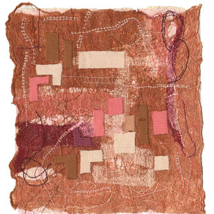 Joomchi è un antico metodo coreano di manipolazione della carta di gelso (mulberry paper, ottenuta dalla corteccia della pianta) che attraverso la lavorazione con le mani e l’acqua si trasforma: una metamorfosi che da vita a nuovi colori e nuove trame. I sottili strati di carta sovrapposti, gradualmente umidificati con acqua e delicatamente a lungo spremuti e impastati, determinano l’intrecciarsi delle fibre, creando una nuova entità-foglio resistente e unica. Inizialmente considerata una tecnica artigianale ha saputo conquistare il suo posto nell’arte. Ispirata dalla nuova texture ecco che affiorano immagini, ricordi, sensazioni. A volte è un flash della memoria che mi indirizza verso un soggetto o un tema. Altre volte invece inizio d’istinto, lascio che sia l’ago a parlare e lavorando la superficie il lavoro prende forma. Avanzo lentamente, valuto man mano il peso del mio intervento tessile sulla superficie, colore, posizione; stabilisco gli equilibri, il ritmo. I contrasti mi interessano. La direzionalità dell’opera può cambiare in corso di lavorazione: il lato basso dal quale sono partita può diventare il lato alto a fine lavoro. Tuttavia l’immagine non è statica, lo spettatore deve sentirsi libero di interpretare il senso del movimento a suo piacere.